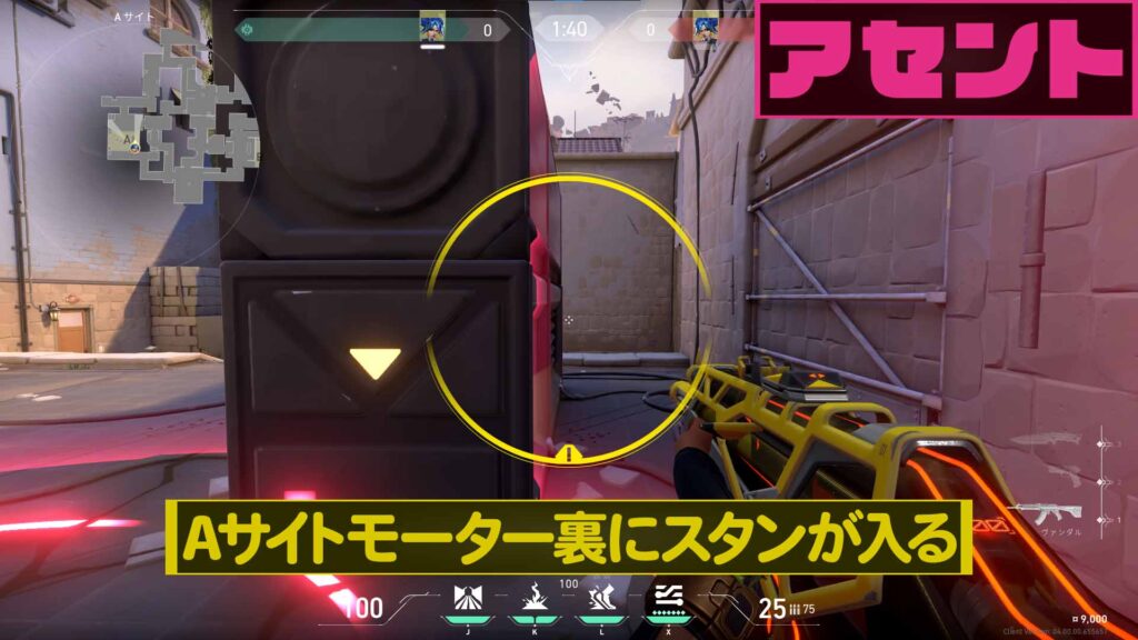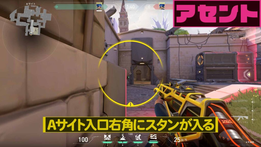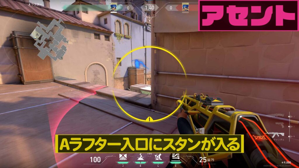 ホームMap[マップ]ASCENT[アセント] 【VALORANT】アセント×ネオン 現最強!?激強エントリーリレーボルトスタン【002】【小技】 2022年1月25日2022年6月5日 SHARE ツイート シェア はてブ LINE Pocket ツイート シェア はてブ LINE Pocket YouTube Twitter Instagram 概要 今回はアセントでネオンのリレーボルトを使った最強エントリーを紹介したいと思います。 マップ エージェント 実践 配置に着く Aメインのドア左に張り付きます。 発動準備 隙間から見えるパイプの継ぎ目の一番上にクロスヘアの中心を合わせます。 ズームするとこんな感じ。 発動 そのままリレーボルトを放ちます。 テトリスに張り付いた相手に対してスタンが入ります。 Aサイトモータ裏にいる相手に対してスタンが入ります。 Aラフターに隠れた相手に対してスタンが入ります。 同時に3か所スタンが入る為かなり強いので試してみてください。 プロがオススメするデバイス紹介 BENQ ゲーミングモニター ZOWIE esports [24.5型 /ワイド /フルHD(1920×1080)] XL2546Kposted with カエレバ楽天市場Amazon Logicool G PRO X SUPERLIGHT ワイヤレス ゲーミングマウス 史上最軽量 63g未満 LIGHTSPEED無線技術 HERO 25Kセンサー POWERPLAY無線充電対応 G-PPD-003WL-BK G-PPD-003WL-WH ブラック ホワイト 国内正規品 2年間無償保証posted with カエレバ楽天市場Amazon Logicool G PRO X ゲーミングキーボード テンキーレス 有線 GXスイッチ クリッキー 日本語配列 LIGHTSYNC RGB 着脱式ケーブル G-PKB-002 国内正規品 2年間無償保証posted with カエレバ楽天市場Amazon Logicool G テンキーレス ゲーミングキーボード 無線 G913 GLスイッチ リニア タクタイル クリッキー 日本語配列 LIGHTSPEED ワイヤレス Bluetooth LIGHTSYNC RGB G913-TKL-LNBK 国内正規品 2年間無償保証posted with カエレバ楽天市場Amazon VALORANT関連商品 【ポイント5倍 6/22 19:59迄】 WIS 23.8インチ 165Hz ゲーミングモニター PS5 PS4 VALORANT SWITCH APEX FPS FORTNITE PUBG LOL 液晶ディスプレイ MPRT 1ms FHD フルHD HDMI 非光沢 メーカー保証3年価格:24,800円(税込、送料無料) (2023/6/17時点)楽天で購入【新品】【今ならRTX2060、12世代CPUにアップ! 】ゲーミングPC デスクトップパソコン GeForce RTX2060 22型液晶モニター付 第12世代 Intel 12100F 3.30GHz 最大4.30GHz 4コア 8スレッド Win10 NVMe M.2 SSD256GB メモリ16GB ゲーミングパソコン eスポーツ PASOUL 煌価格:99,800円(税込、送料無料) (2023/6/17時点)楽天で購入ゲーミングヘッドセット Razer レイザー Kraken Black ゲーム PC switch PS4 PS5 Xbox FPS 人気 マイク付き ヘッドホン 通話 ヘッドセット クラーケン ブラック 【送料無料】価格:6,980円(税込、送料無料) (2023/6/17時点)楽天で購入 コメントを残す コメントをキャンセルメールアドレスが公開されることはありません。 ※ が付いている欄は必須項目ですコメント ※ 名前 ※ メール ※ サイト 次回のコメントで使用するためブラウザーに自分の名前、メールアドレス、サイトを保存する。 Δ