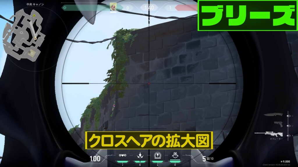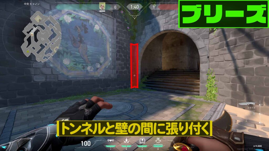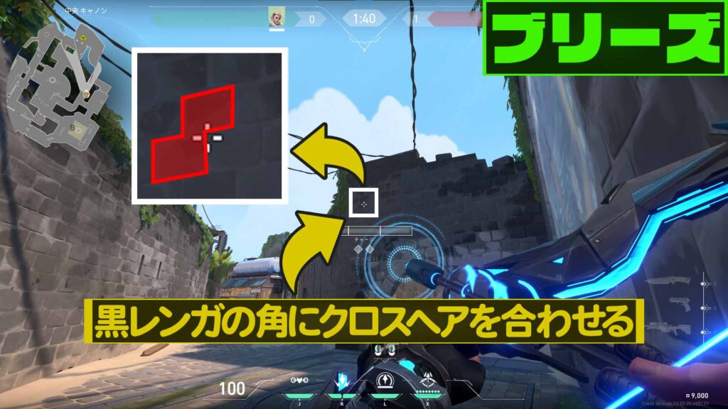 スポーン側を向いて壁にある2つの黒レンガの角にクロスヘアを合わせる。